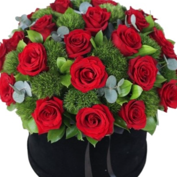 Produktcode: ABF31Vorbereitet mit 25 Rosen und Grünpflanzen in einer zylinderförmigen Blackbox.