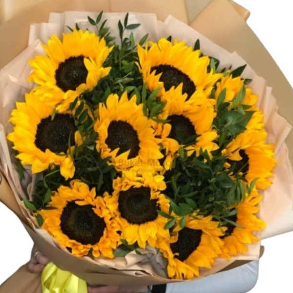Produktcode: ABF4Eleganter Blumenstrauß aus 11 Sonnenblumen und Grünpflanzen