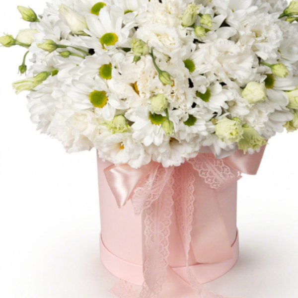 Ürün Kodu: ABF14Pembe Kutuda 15 Dal Beyaz Papatya 11 Dal Beyaz Lisyantuslar İle Hazırlanmıştır.